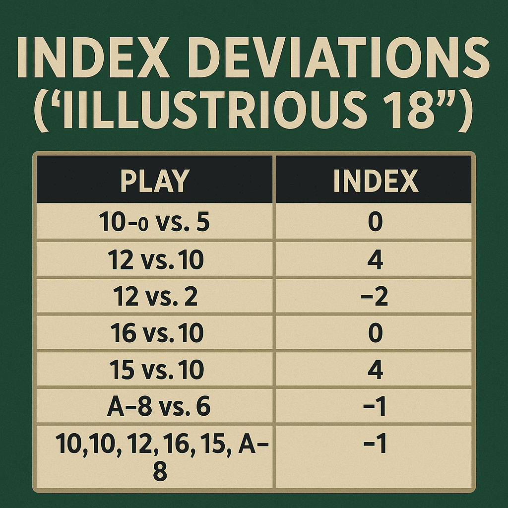 - Index deviations (“Illustrious 18”) that squeeze extra edge beyond basic strategy.