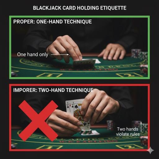 Why It Matters: Security cameras must see all cards. Suspicious handling (bending, hiding, two-hand holding) triggers hand cancellation or removal. Casinos protect against card marking and edge-sorting cheating.