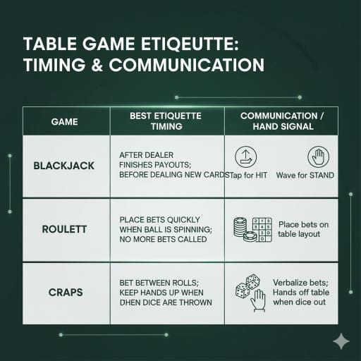 - Learn game-specific standards (blackjack signals, roulette timing, craps shooter respect)