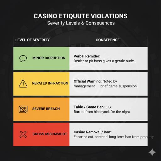 Quick Takeaway: Blackjack etiquette: Hold cards in one hand, use clear hand signals (tap to hit, wave to stand), never touch chips mid-round, and use designated spots for doubles/splits. Roulette etiquette: Buy chips between spins, make bets decisively, and have minimal table interference. Craps etiquette: Never interfere with dice, keep hands visible, respect shooter space, and avoid saying “seven.” Violations range from reminders to removal.