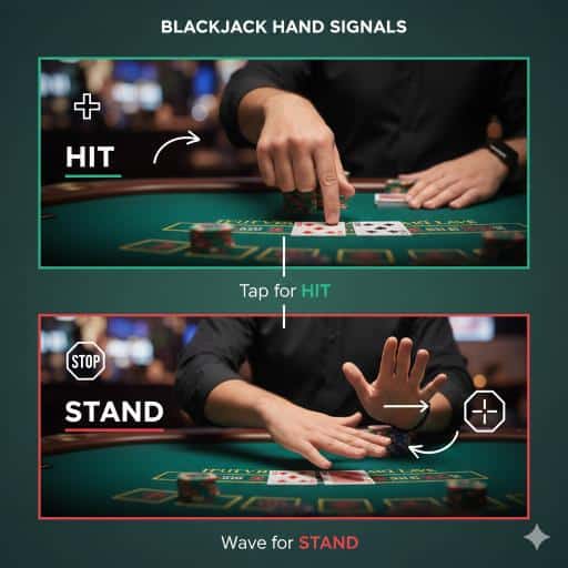 Hit Signal: Tap the table behind cards or make subtle scratching motion. Say “Hit” clearly. In noisy casinos, signals ensure accuracy.